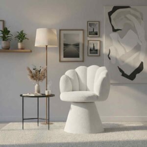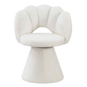 Kėdė MELO – moderni, minkšta ir jauki kėdė, išsiskirianti subtiliu dizainu, įkvėptu kriauklės formos. Aptraukta buklė („baranek“) audiniu, kuris suteikia interjerui šilumos ir vizualinio švelnumo. Puikiai tinka valgomojo, miegamojo, darbo ar grožio zonoms.