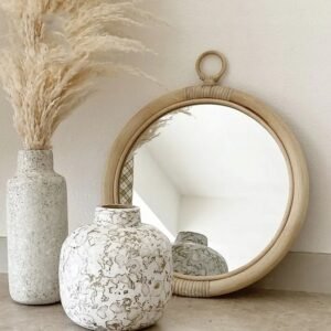 TULUMI – rankų darbo veidrodis su natūralių medžiagų rėmu, įkūnijantis boho stiliaus žavesį. Unikalus ir šiltas interjero akcentas, tinkantis tiek svetainei, tiek voniai ar net terasai.