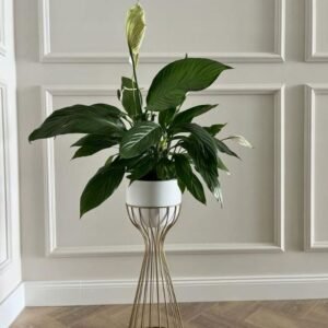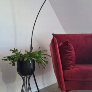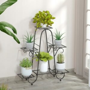 Skoningas juodas gėlių stovas leidžia estetiškai ir organizuotai užpildyti namus žaluma.