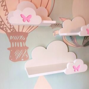 Lentynų rinkinys BUTTERFLY – žavingos debesėlių formos lentynos su rožiniais drugeliais, sukurtos jaukiam vaikų kambariui. Pagamintos iš atsparaus laminuoto MDF, jos sujungia funkcionalumą, kokybę ir pasakišką dizainą, suteikdamos erdvei lengvumo bei švelnumo.