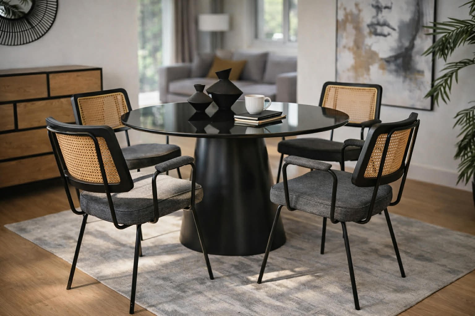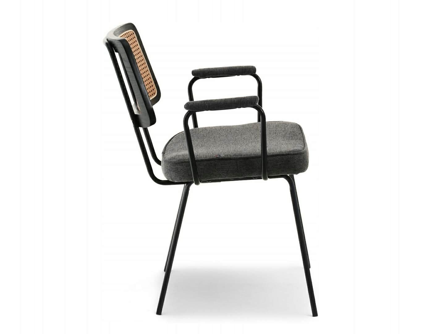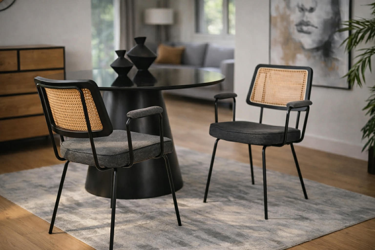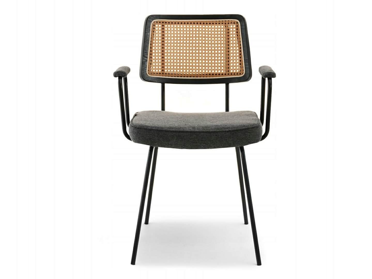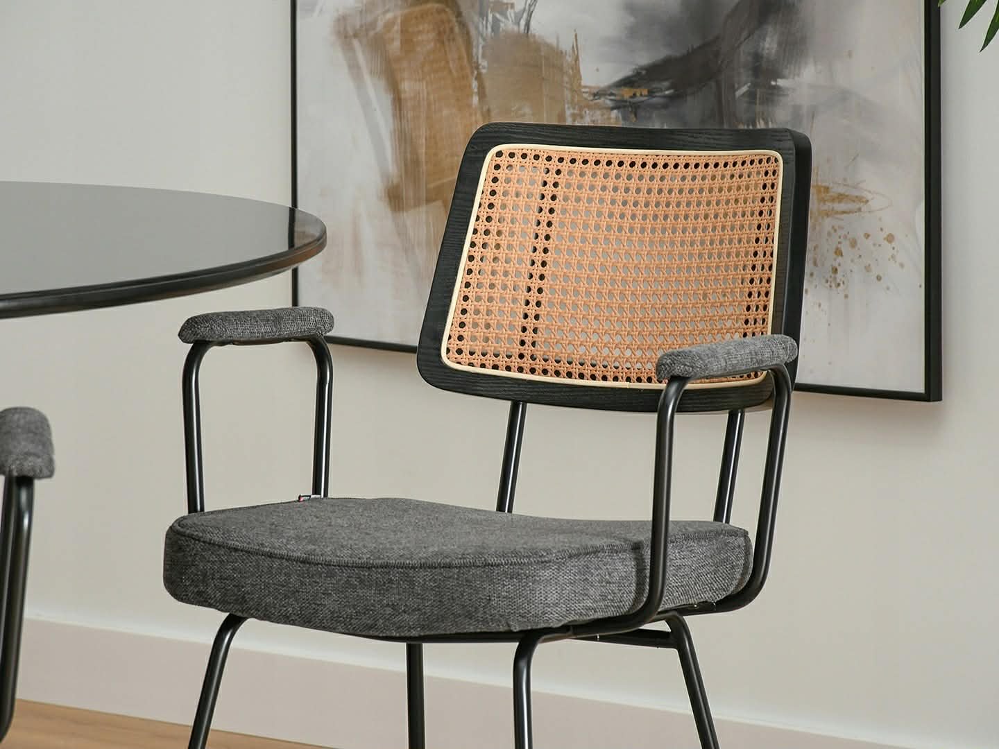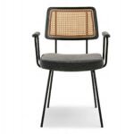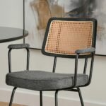 Elegantiška boho stiliaus kėdė CECIL su rataniniu atlošu ir porankiais. Natūralaus ratano imitacija suteikia lengvumo ir jaukumo, o minkšta sėdimoji dalis užtikrina komfortą kasdieniam naudojimui. Puikiai tinka valgomajam, svetainei ar stilingai darbo vietai.