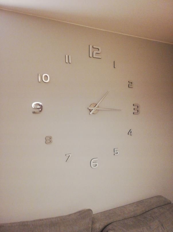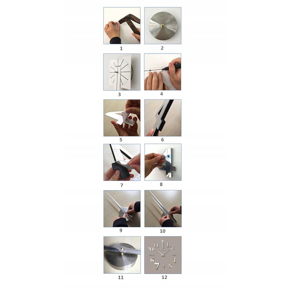 Laikrodžio surinkimas greitas ir patogus. Ciferblatas su rodyklėmis turi būti tvirtinamas ant kabliuko. Dekoratyviniai elementai prie sienos tvirtinami montavimo juosta. Kiekvienas elementas yra klijuojamas juostele. Laikrodis turi šabloną, kad galėtumėte tiksliai išdėstyti elementus ant sienos.