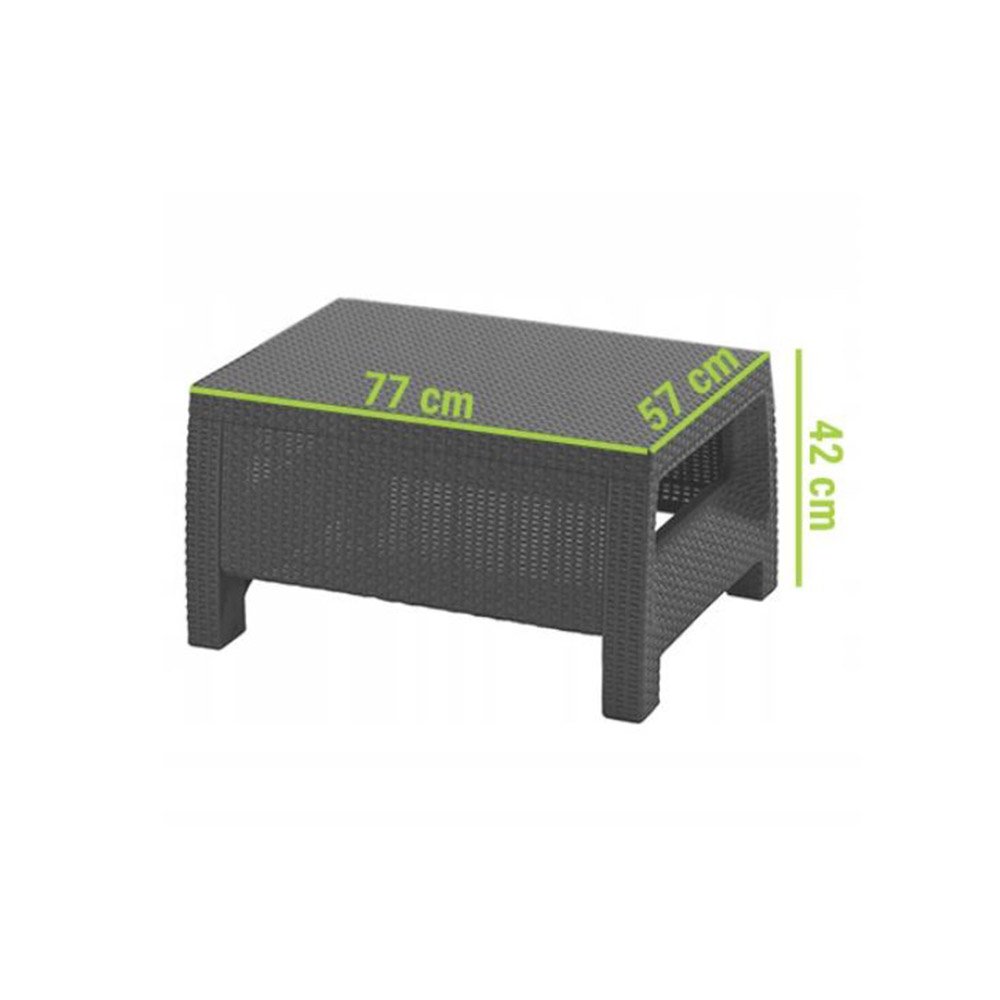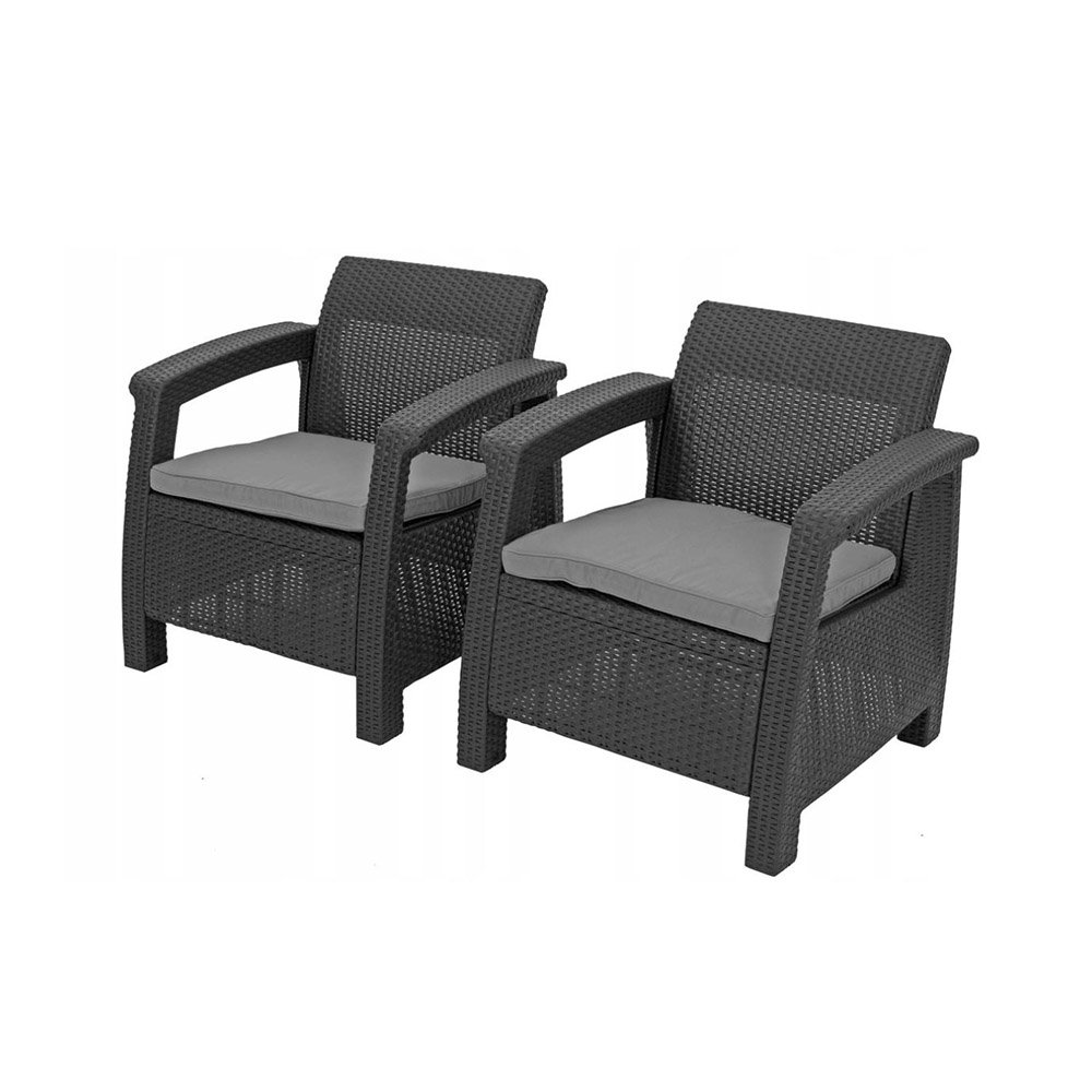 Praktiškas šiuolaikiško ir elegantiško stiliaus sėdimų vietų komplektas terasai arba balkonui. Baldai pagaminti iš aukštos kokybės polipropileno, tai patvarus plastikas, pasižymintis išskirtiniu patvarumu. Komplektas atsparus oro sąlygoms, vandeniui ir UV spinduliams. Galima naudoti lauke 0-40°C temperatūroje.