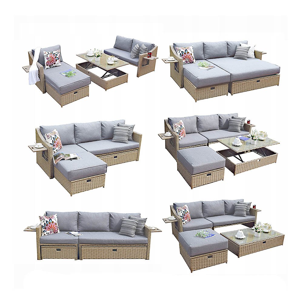 Smėlio atspalvių technorotango, lauko baldu komplektas. Sėdynės pagalvėlės 5 cm storio, atlošai 7 cm storio. Pagalvių užvalkalai su užtrauktukais, galima skalbti. Stalas su reguliuojamo aukščio 5 mm storio stiklo stalviršiu. Galimybė įvairiai išdėstyti baldų elementus arba nenaudojant sulankstyti į mažesnį dydį. Taip sutaupoma vietos, kai komplektas nenaudojamas.