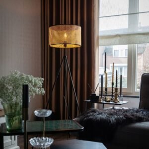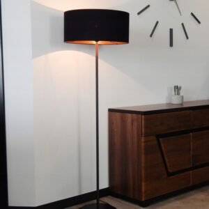 Pastatomas šviestuvas LANTON – elegantiškas ir subtilus pasirinkimas jūsų namams. Juodas metalinis korpusas, audinio gaubtas su šilta aukso–vario folija ir solidus pagrindas sukuria jaukią atmosferą bet kuriame kambaryje. Puikiai tinka tiek moderniam, tiek klasikiniam interjerui.