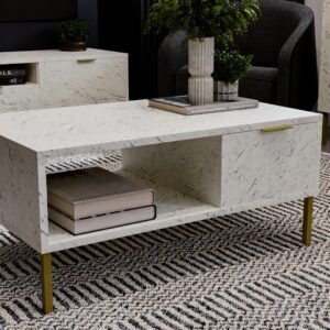 Kavos staliukas ORLANDO – modernios elegancijos ir funkcionalumo derinys. Marmuro rašto paviršius, auksinės kojos ir praktiškos lentynos suteikia šiam baldui prabangos bei patogumo. Pagamintas iš aukštos kokybės laminuotos plokštės, atsparus įbrėžimams ir kasdieniam naudojimui.