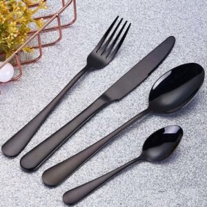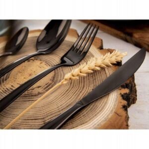 Originalių, blizgios, juodos spalvos stalo įrankių rinkinys 6 asmenims. Rinkinys suteiks Jūsų stalui išskirtinio charakterio ir nustebins svečius savo išvaizda.