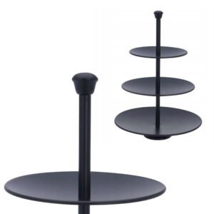 3 aukštų stovas CONFECTIONERY – elegantiškas ir jaukus sprendimas desertams ar užkandžiams patiekti. Skirtingų dydžių aukštai leidžia gražiai išdėlioti keksiukus, sausainius ar vaisius. Pagamintas iš matinio juodo metalo, lengvai valomas ir puikiai dera prie šventiško ar kasdienio stalo.