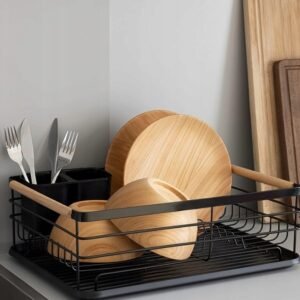 Metalinė juoda džiovyklė su medinėmis rankenomis bus itin elegantiškas sprendimas bet kurioje virtuvėje.